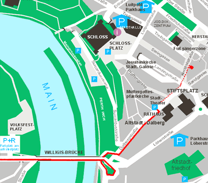 | Ausfahrt (57), Aschaffenburg-West auf die B469 Richtung Stockstadt. Nach 4km Ausfahrt Großostheim Richtung Aschaffenburg auf B26. Nach ca. 8km an der Ampel (T-Kreuzung) links abbiegen Richtung Innenstadt über die Williges Brücke. Direkt hinter der Brücke rechts ab und danach sofort wieder rechts. Dann bis zur nächsten T-Kreuzung und dort links in die Dalbergstraße einbiegen. | ![]() |