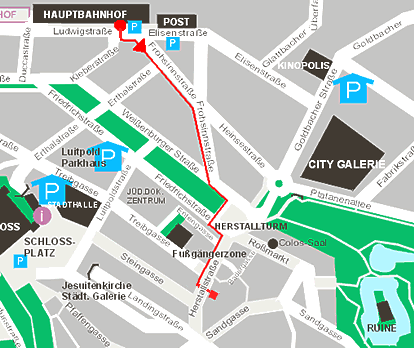 | Sie verlassen den Hauptbahnhof, gehen halb links in die Frohsinnstraße und folgen dieser bis zum Ende. Dann links auf die Weissenburger Straße. Sie überqueren die Straße am Herstallturm und gelangen direkt in die Herstallstraße. | ![]() |